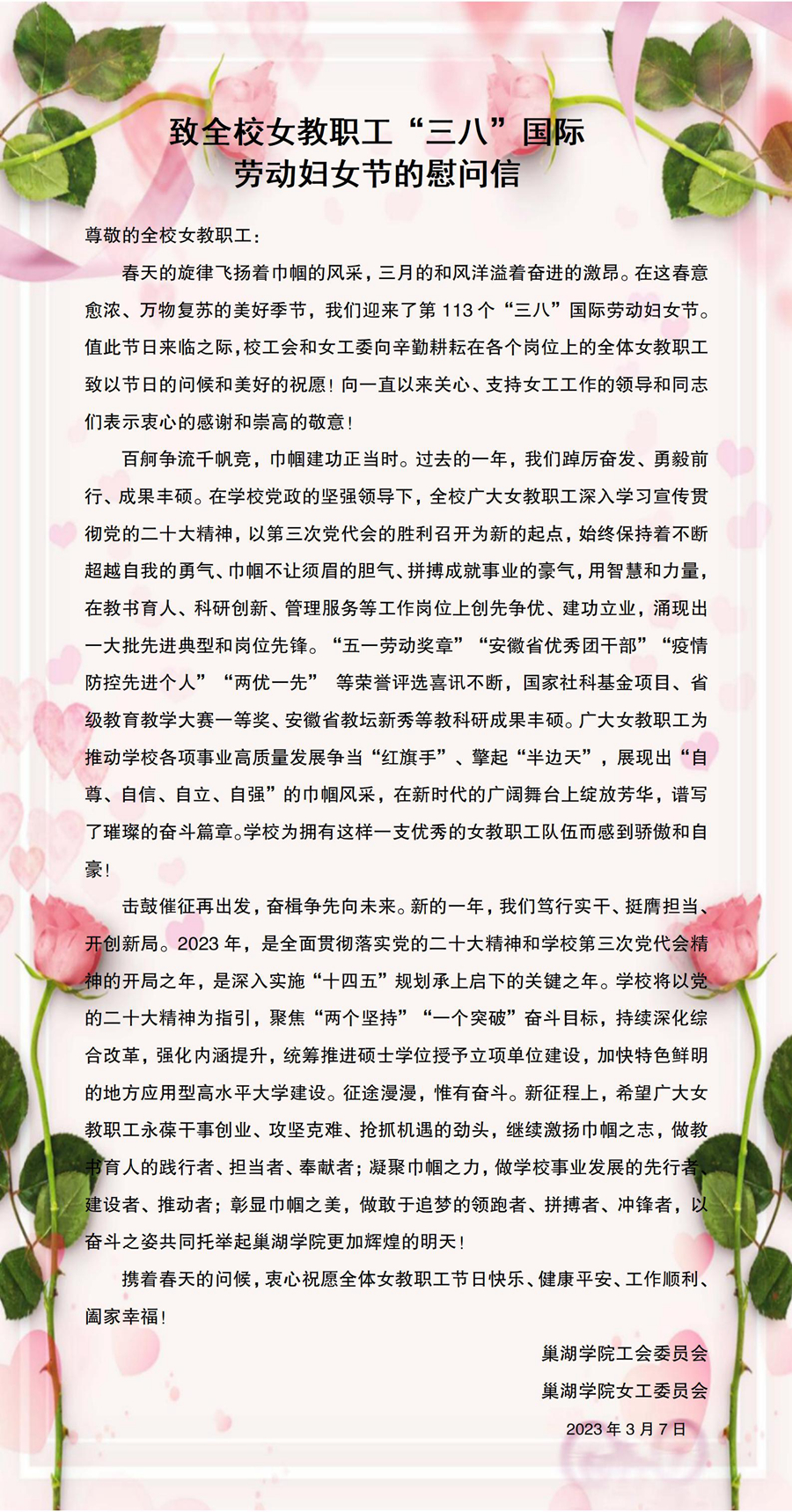 致全校女教职工“三八”国际劳动妇女节的慰问信